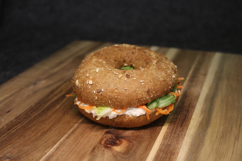 Leckerer Malzmehrkornbagel mit frischem Salat, feinen Karottenstreifen und cremigem Frischkäse-Aufstrich.