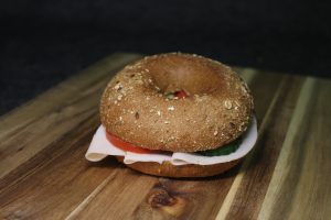 Leckerer Malzmehrkornbagel mit Hähnchen, frischen Tomaten und Gurken.