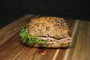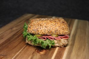 Belegtes Sonnenblumenbrötchen mit Putenschinken, Gewürzgurken und frischem Salat.