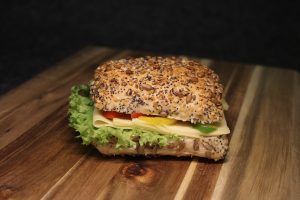 Belegtes Sonnenblumenbrötchen mit Gouda, Paprika und frischem Salat.