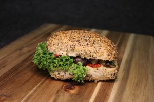 Belegtes Sonnenblumenbrötchen mit Hummus, Grillgemüse und frischem Salat.