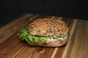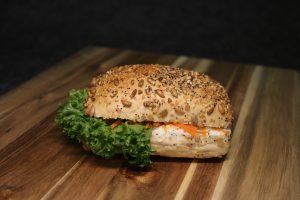 Belegtes Sonnenblumenbrötchen mit cremigem Frischkäse, Schnittlauch und frischem Salat.