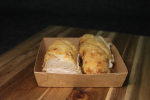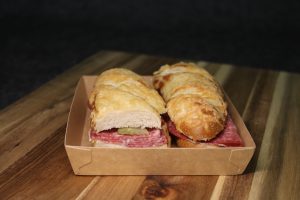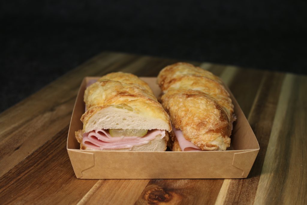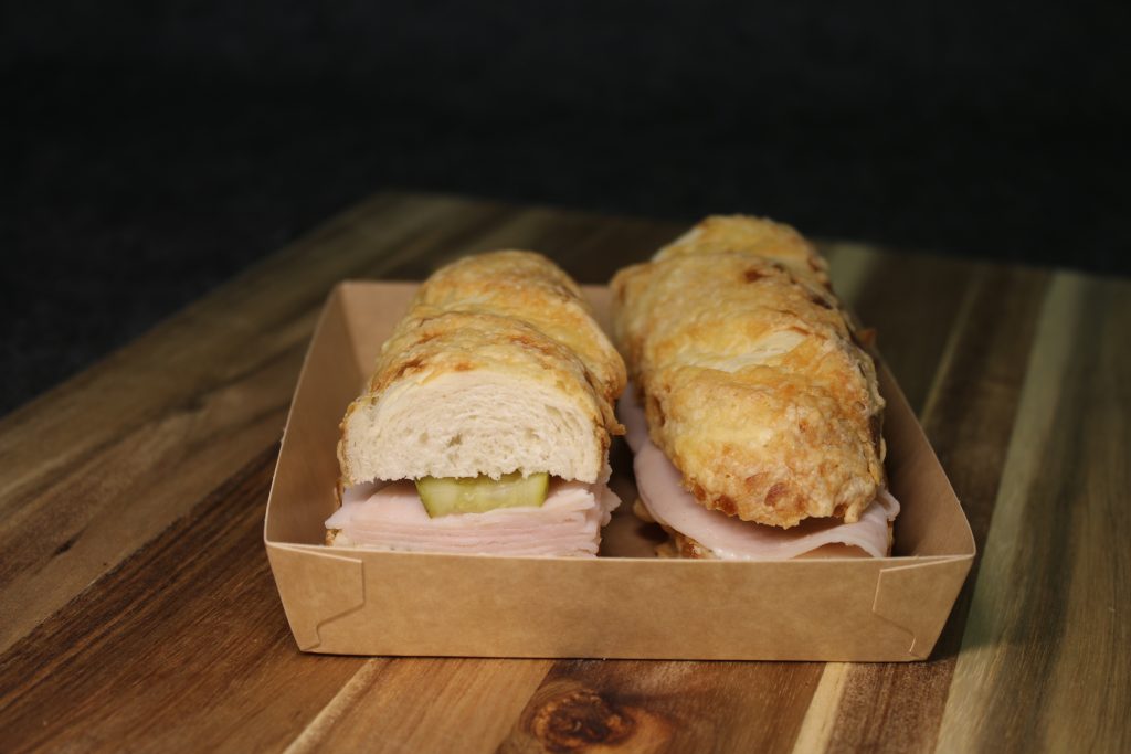 Belegte Laugenkäsestange mit leckerem Schinken und Gewürzgurke, halbiert und in praktischer Schale.