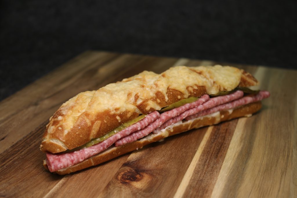 Belegte Laugenkäsestange mit leckerer Salami.
