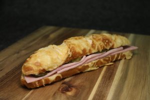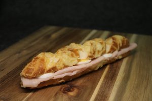 Belegte Laugenkäsestange mit leckerem Schinken