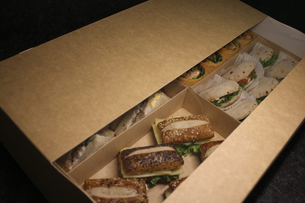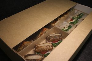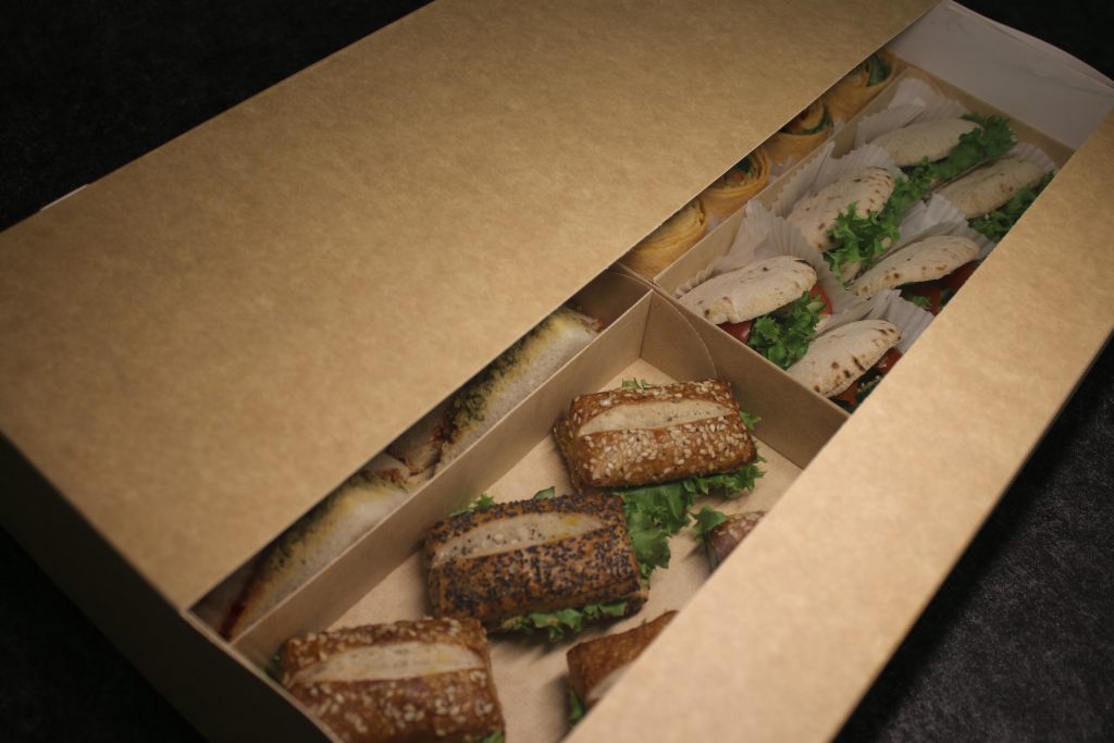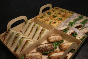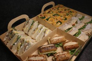 Eine leckere Mischung aus Sweet Chili Chicken Wraps, Thunfisch Sandwichs, Emmentaler Laugenkonfekte und Frischkäse Minipiten.