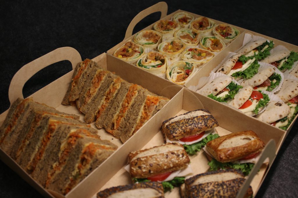 Eine leckere Mischung aus Thunfisch Wraps, Sweet Chili Jackfruit Sandwichs, Hähnchen Laugenkonfekte und Tomate Mozzarella Minipiten.
